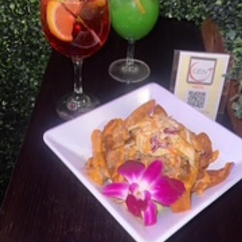 Our Signature Wonton Chips Loaded with your Chicken $14.00 | Shrimp $18.00 | Oxtail $19.00, House Asian Slaw and Drizzled with our Delicious Czen Aioli Sauce
